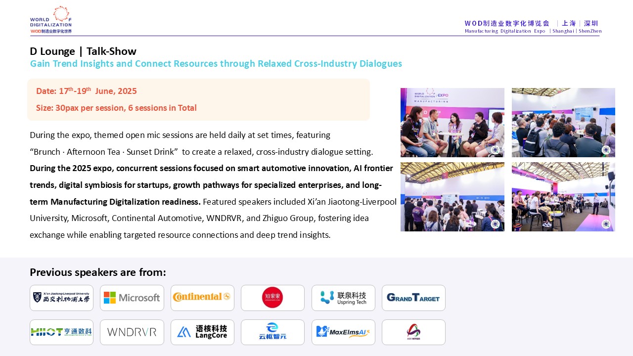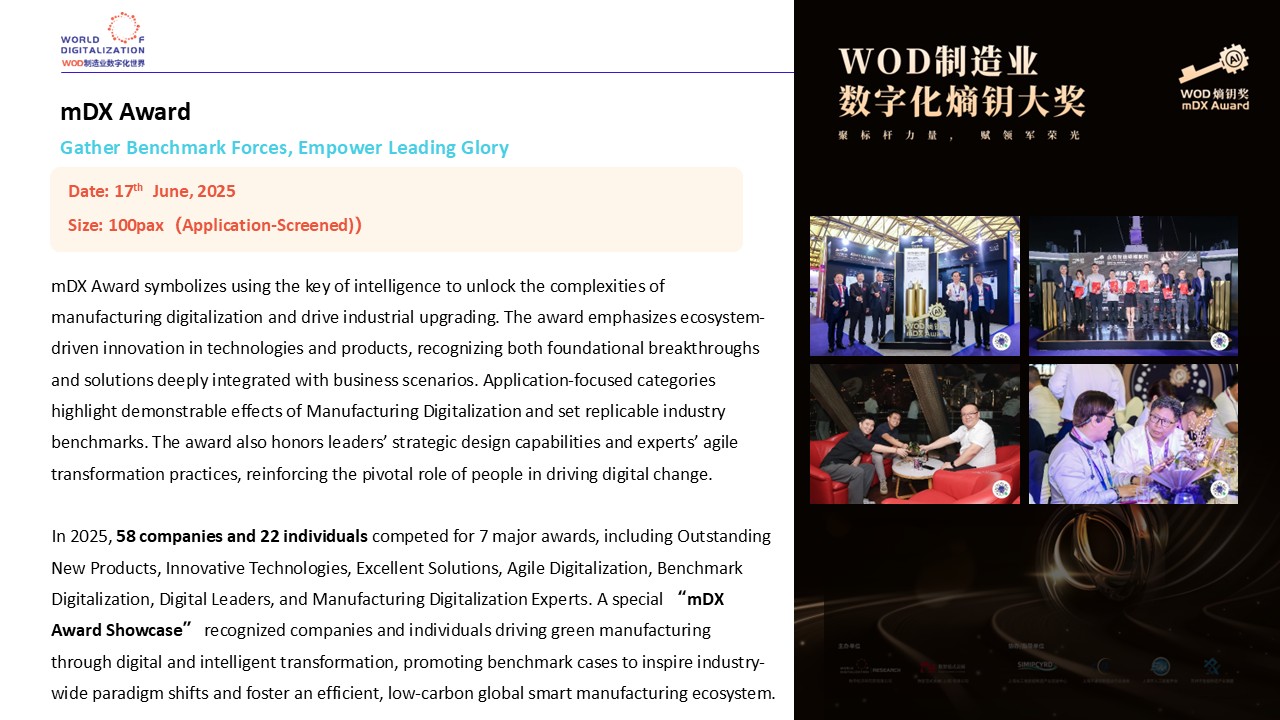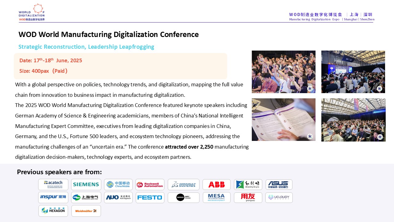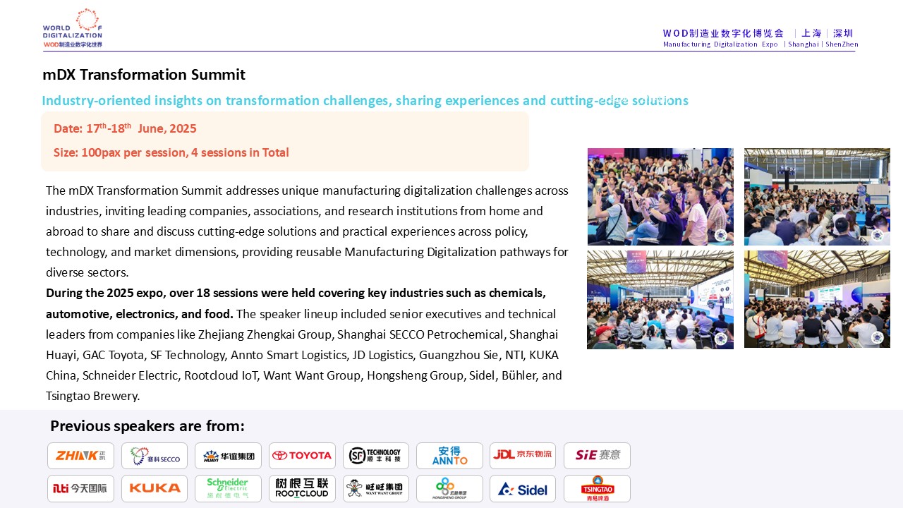 WOD Manufacturing Digitization Expo 2025 (Shanghai) was successfully held on June 17-19 at Shanghai New International Expo Center. During the same period, WOD World Manufacturing Digitization Conference was launched as a platform, linking WOD Think-Tank·The Bund, mDX Award, mDX Transformation Summit, mDX Best Practice Workshop, mDX Supply and Demand Matching Salon, and Demand Side D VIP Room Social Open Mai and other diversified scenarios, to form a value closed-loop of “High-end Dialogue + Practical Sharing + Benchmarking Leadership + Precise Matchmaking”, which aims to break the “single point” in the transformation process.