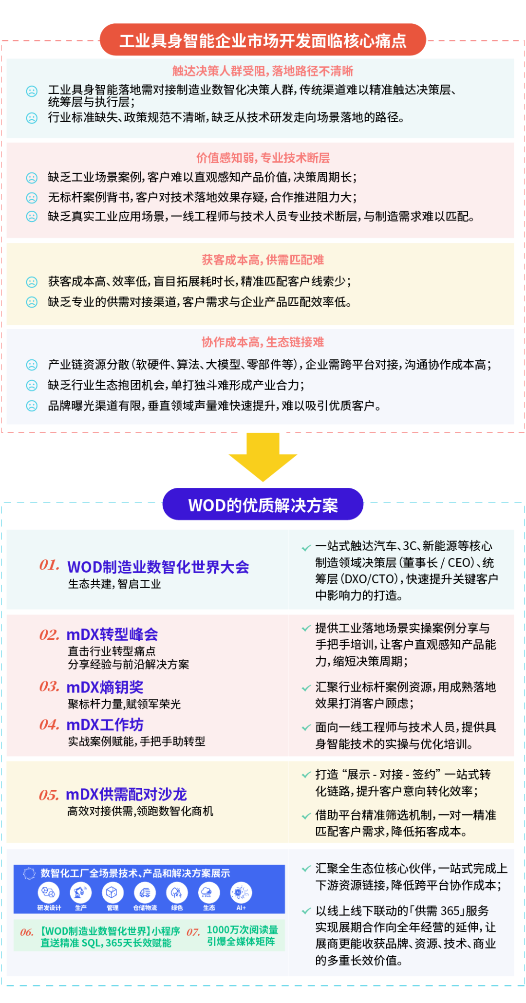 WOD是全球唯一聚焦制造业数智化转型领域的平台、基于其汇聚的50,000+精准人群,为工业具身智能的落地对接制造业中负责数智化转型的人群,助力破解工业具身智能企业市场开发&客户拓展全链路难题,构建具身智能企业 - 制造场景落地精准对接枢纽。