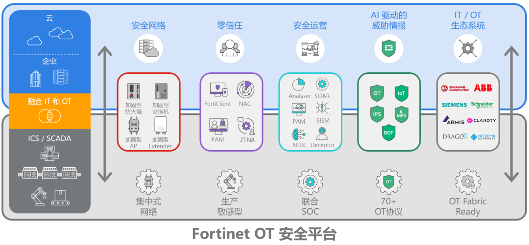 采用平台方法构建整体OT网络安全架构至关重要,Fortinet 围绕Security Fabric统一平台构建基础驱动层(ASIC、AI与生态系统支撑)、整合与融合层(FortiOS与Security Fabric)、战略能力层(安全网络、统一SASE、AI驱动的安全运营)三层安全架构,实现OT网络安全从硬件到战略的全栈防护。